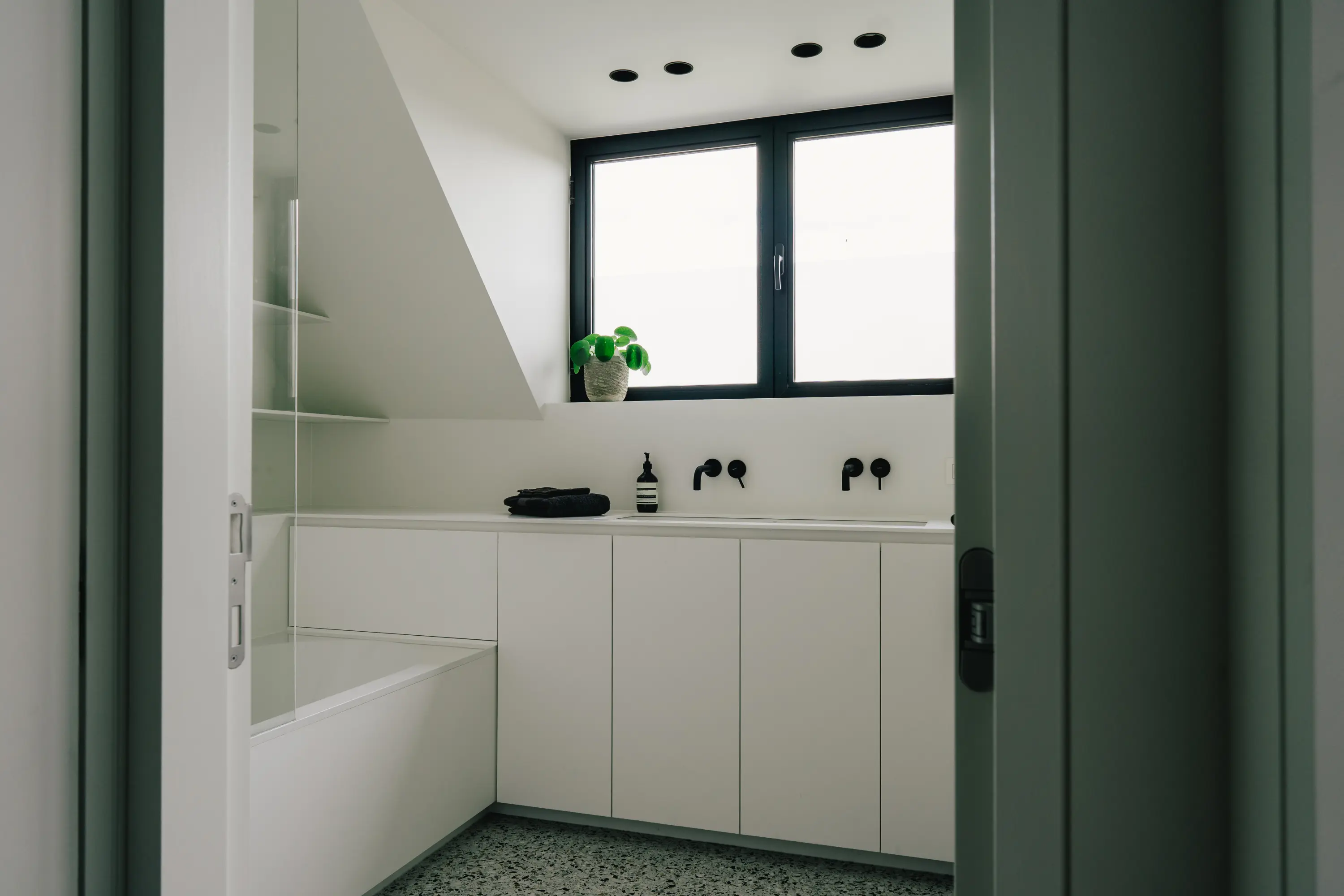Voor deze klant namen we de volledige badkamerrenovatie in handen. De bestaande ruimte werd volledig gestript en heropgebouwd met nieuwe technische leidingen voor sanitair, verwarming en elektriciteit. We vernieuwden niet alleen de leidingen, maar ook vloeren, muren en schrijnwerk, zodat alles perfect op elkaar afgestemd is. Dankzij deze totaalaanpak kreeg de badkamer een frisse, moderne uitstraling én de zekerheid van een duurzame installatie.